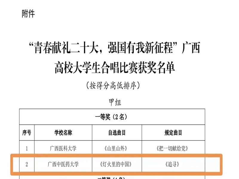 为引导广大青年深入学习党的二十大精神,唱响礼赞新时代的主旋律,以砥砺强国为志,在伟大的复兴道路上发光发热。近日,由自治区党委教育工委、自治区教育厅举办的“青春献礼二十大,强国有我新征程”广西高校大学生合唱比赛圆满结束。我校大学生艺术团合唱团表演的曲目《灯火里的中国》与《追寻》荣获一等奖。