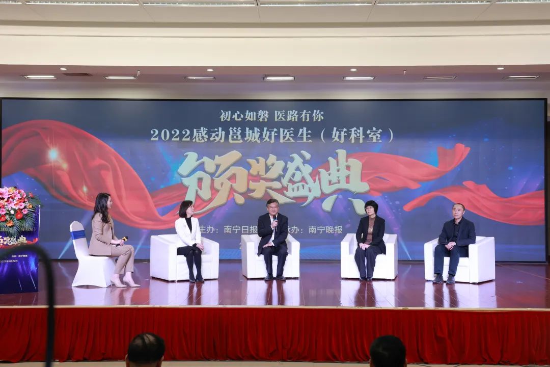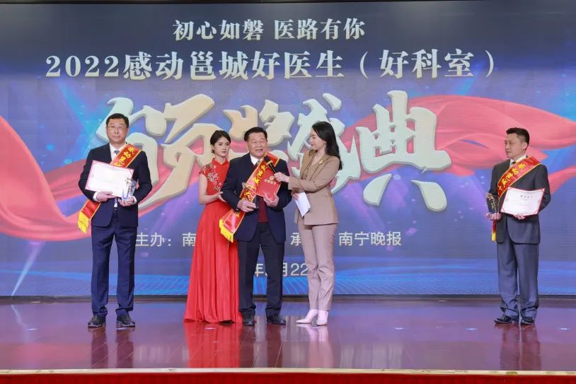 初心如磐,医路有你。2月22日,由南宁日报社主办、南宁晚报承办的2022感动邕城好医生(好科室)颁奖盛典在广西南宁举行。共有30名医生分别荣获“感动邕城十大好医生”“感动邕城妙手好医生”“感动邕城人气好医生”称号, 8个科室荣获“感动邕城好科室”称号。我校附属医院黄瑾明、黄鼎坚、谢胜、李凤珍荣获“感动邕城十大好医生”,史伟、黄贵华、黄锦军、钟远鸣、米琨荣获“感动邕城妙手好医生”,董少龙、王力宁、卢健棋、毛德文、卢森建荣获“感动邕城人气好医生”,第一附属医院推拿科、风湿病科入选“2022感动邕城好科室”。
