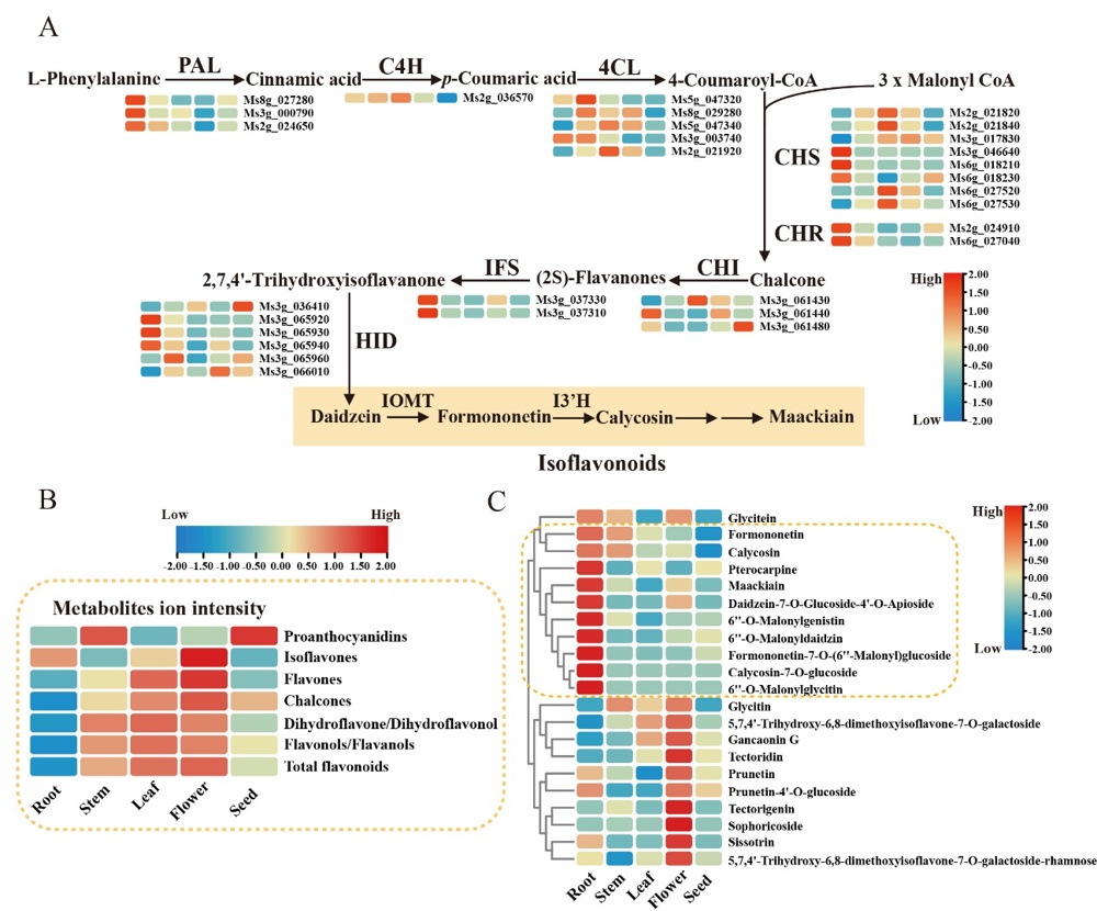 图2 牛大力异黄酮的生物合成通路解析。 A. 牛大力异黄酮的生物合成途径; B. 牛大力代谢产物的离子强度; C. 牛大力不同组织的异黄酮含量。