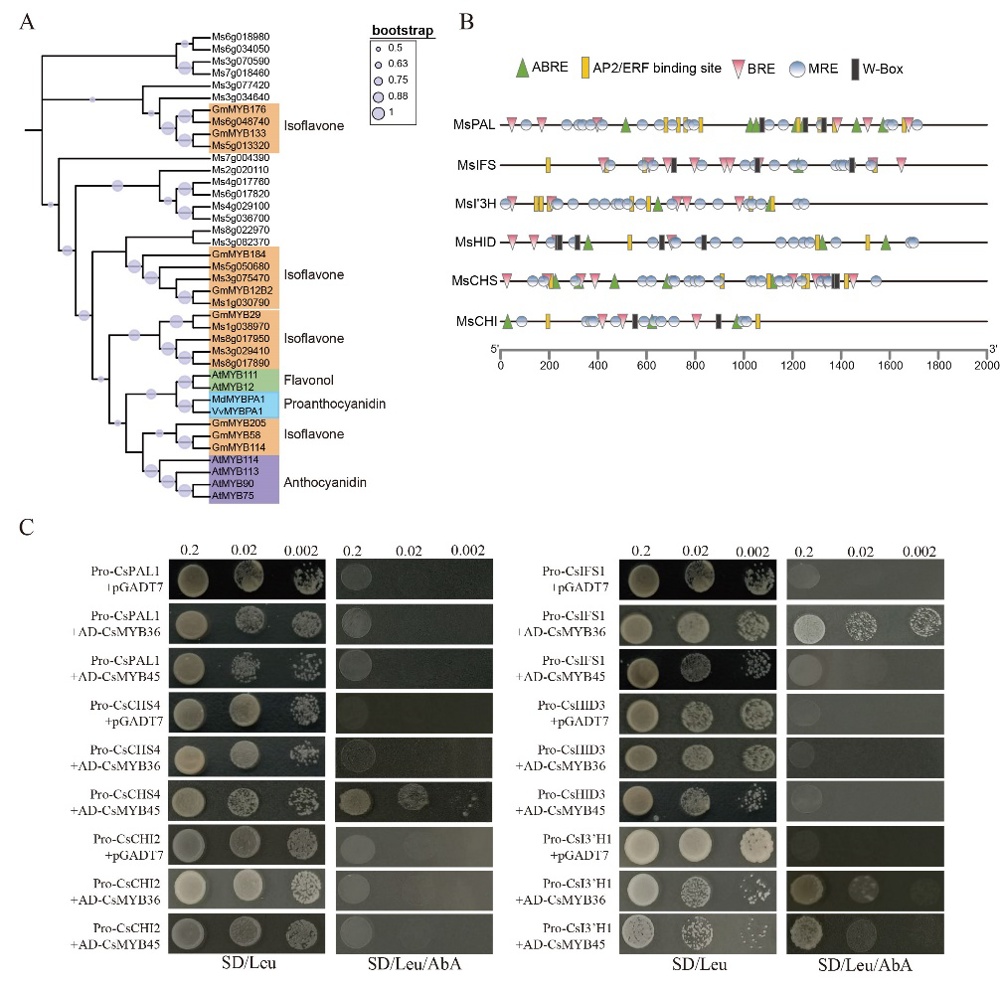 图3 牛大力异黄酮生物合成调控网络的MYB转录因子鉴定与验证。A. 候选MYB转录因子鉴定;B. 结构基因启动子分析;C. 相互作用分析。