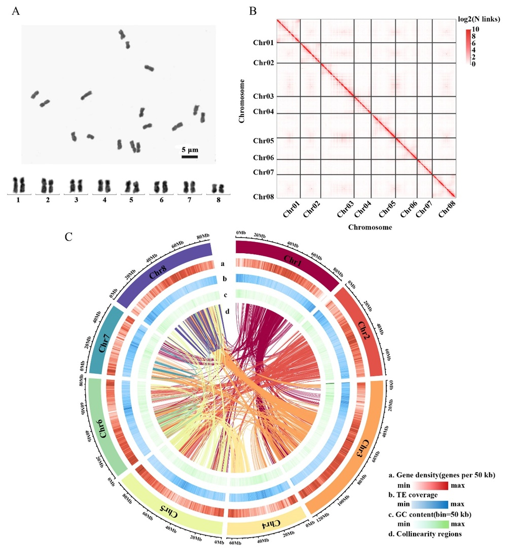 图1 牛大力的基因组特征。 A. 染色体分析;B. Hi-C 相关性热图;C. 基因组特征。