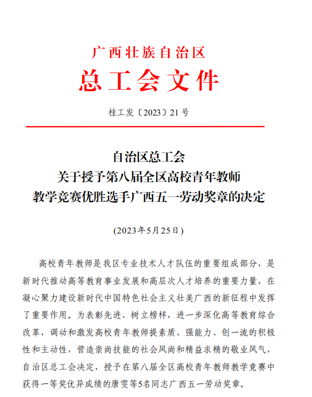 近日,根据《自治区总工会关于授予第八届全区高校青年教师教学竞赛优胜选手广西五一劳动奖章的决定》,我校第一临床医学院方芳老师荣获2023年广西五一劳动奖章。