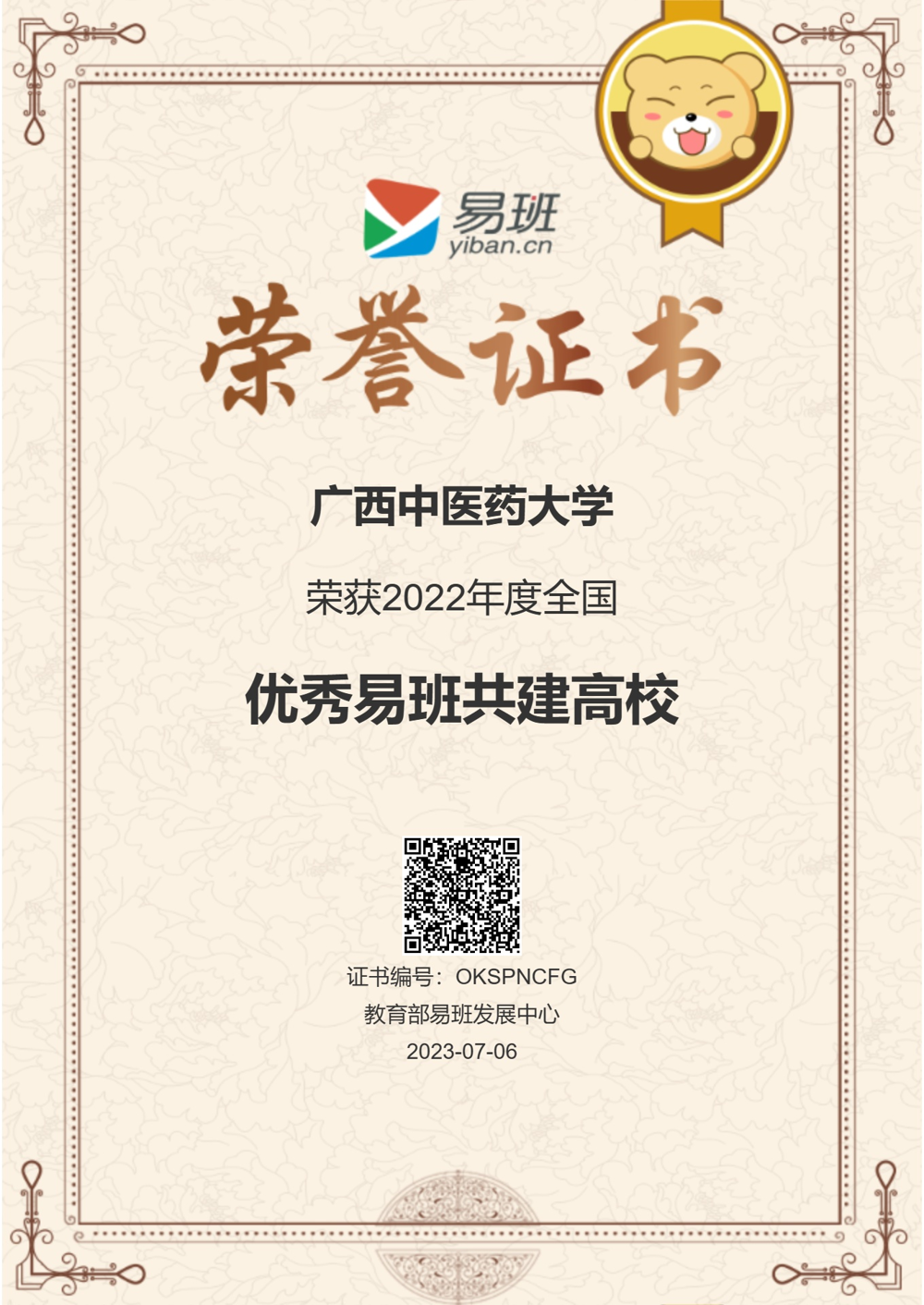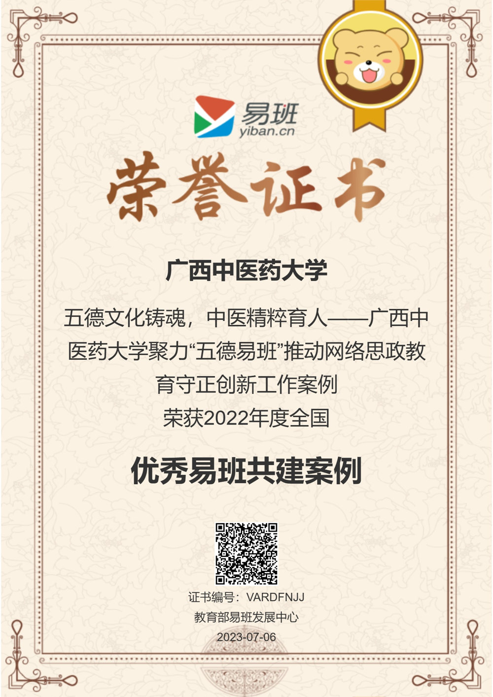 为了表彰2022年度在易班建设方面表现突出的高校、案例、指导教师、辅导员和工作站站长,各省举办了省级易班“十佳”(优秀工作案例)评选活动。教育部易班发展中心共收到了全国25个省区市及新疆生产建设兵团推荐的近900个优秀工作案例。经过专家对各省推荐材料的筛选以及综合考量2022年全年高校易班双指数及活动参与情况,最终选定了235所高校的422项工作案例,分别列入五大类全国易班共建优秀名单。我校被评为“优秀易班共建高校”,同时“五德文化铸魂,中医精粹育人——星空彩票老版本下载聚力‘五德易班’推动网络思政教育守正创新工作案例”荣获“2022年度优秀易班共建案例”。