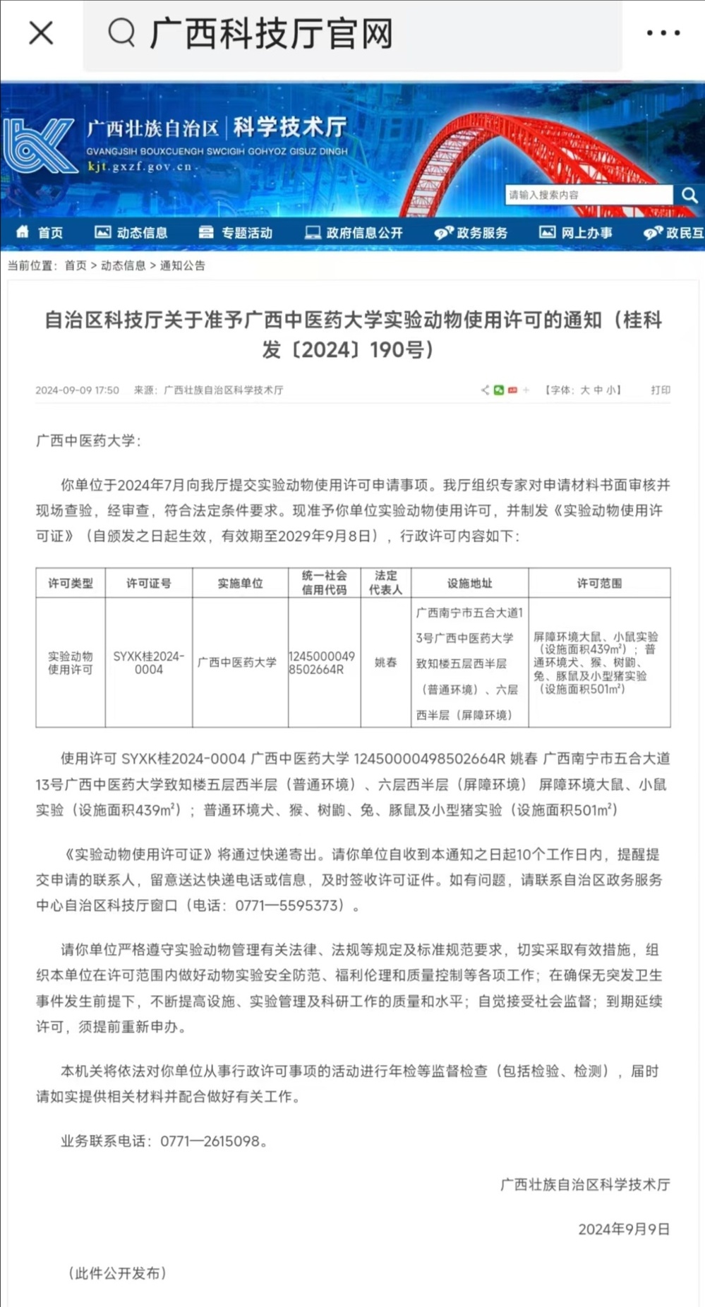 近日,自治区科技厅准予学校新的实验动物使用许可,并制发许可证(许可证号:XYXK桂2024-0004,自颁发之日起生效,有效期至2029年9月8日)。
