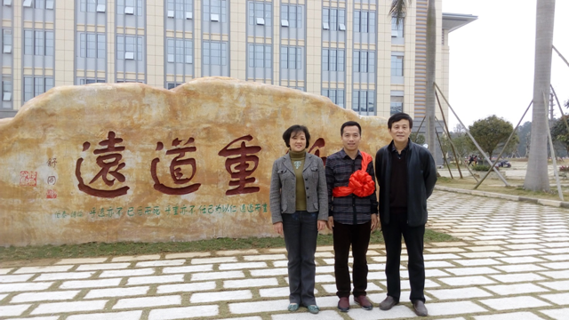学校党委董塔健副书记、人事处伍丹玉副处长与2016年贫困村党组织第一书记黄晓东合影
