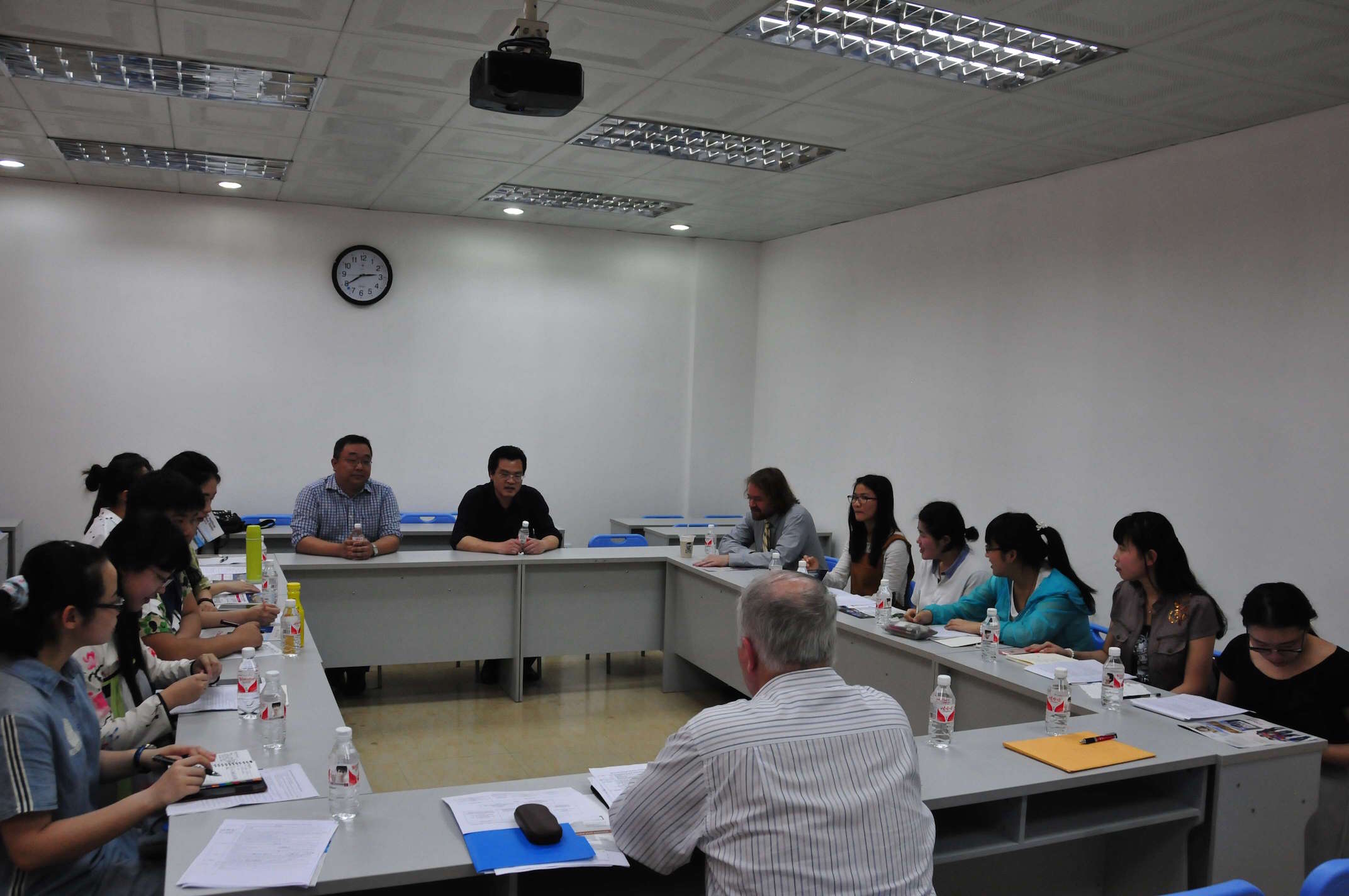 2016年4月6日上午,美国督优维尔学院国际招生与市场部主任罗恩·丹尼卡先生,布法罗中美文化交流中心执行董事陈树清博士一行2人访问星空彩票老版本下载。我校国际教育学院蒋基昌院长在国际教育学院会议室接待了该代表团成员并举行了座谈会。当天下午,美国督优维尔学院罗恩·丹尼卡先生在会展中心展六教室为两校合作举办的护理学本科项目的2015级学生代表进行了现场答疑会。