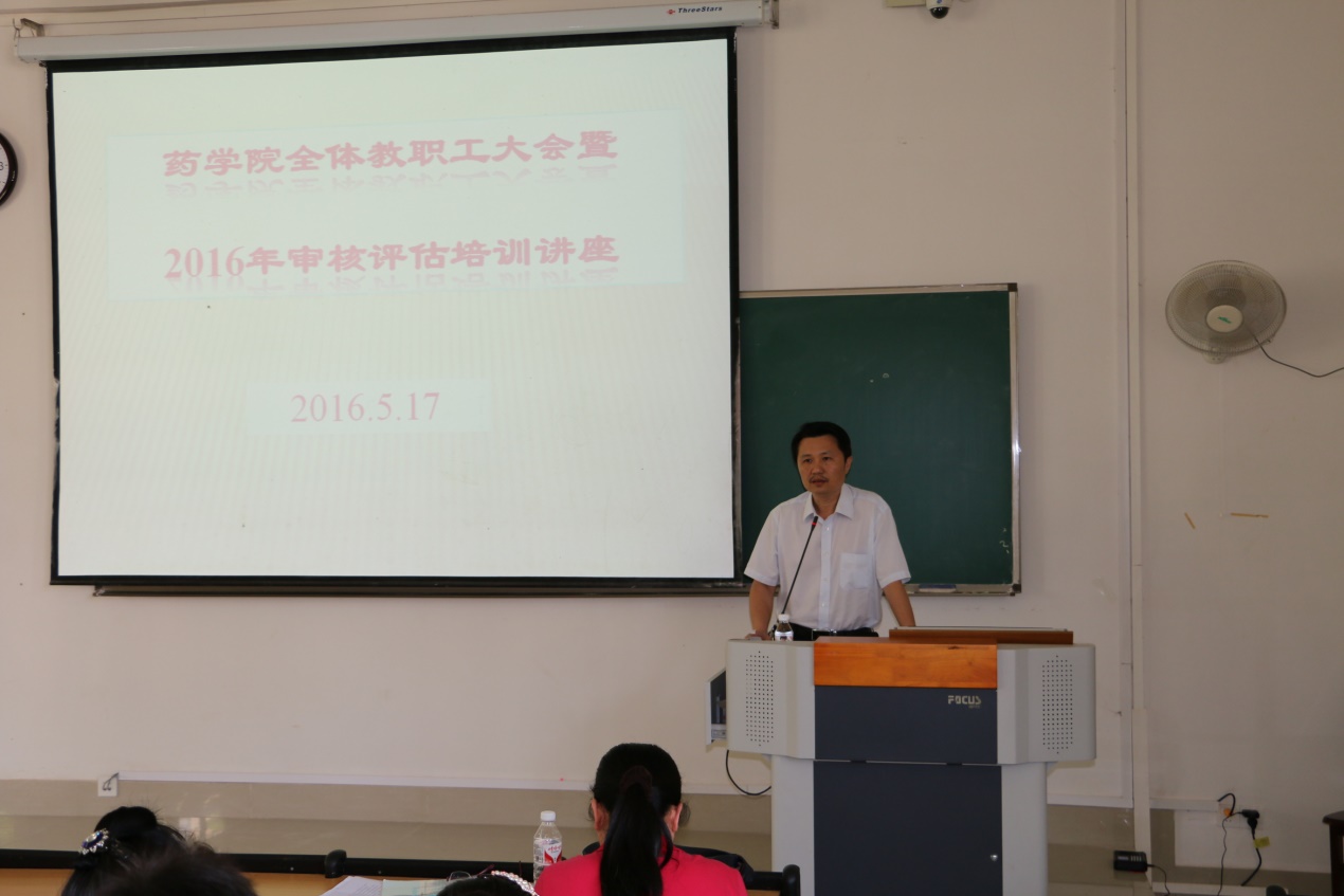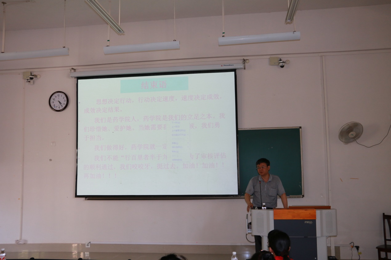 庞宇舟副校长首先向药学院全体教职工通报了5月12-13日我校开展的审核预评估工作的审核结果,指出药学院还需进一步努力争取进入全员迎检的紧张状态,要求药学院做好本科教学审核评估工作的再部署、再动员工作,并提出三点要求:一、教研室主任一定要负起迎检的责任;二、药学院领导班子要深入各个教研室检查工作,分别约谈教研室主任;三、药学院全体教职工要鼓足干劲,发挥主人翁精神参与本科教学审核评估工作,也为明年中药学专业认证奠定基础,不拖学校后腿。