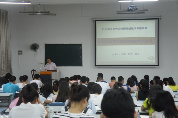 7月4日晚,由科技处、教务处等部门牵头,瑞康临床医院承办的科研反哺教学讲座 “中医药治疗艾滋病关键技术及应用”在明秀校区西B3教室成功举行,讲座对象为瑞康临床医学院2013级临床医学专业同学,讲座吸引200多名同学到场聆听,气氛热烈。