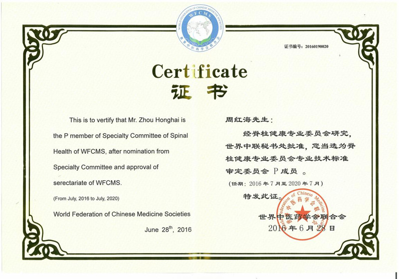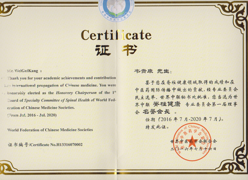 会后,我校中医骨科专家韦贵康教授被聘为该专业委员会名誉会长,周红海教授为第一届副会长与专业技术标准审定委员会成员,陆延医师、田聪医师被聘为会员,经专业委员会网上七天公示无异议,由世界中医药联合会寄来证书。