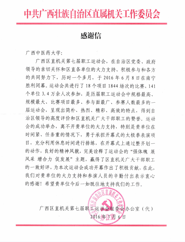 中共广西壮族自治区直属机关工作委员会发来感谢信 来源:体育部 作者:吴国天 日期:2016-09-07 点击数: 次 分享到: 日前,中共广西壮族自治区直属机关工作委员会在给我校的感谢信中盛赞我校太极拳表演队,认为我校在区直机关第七届职工运动会开幕式上表演的太极拳通过整齐划一的动作、良好的精神风貌,完美诠释了运动会“强体质、展风采、增合力、促发展”的主题,赢得了区直机关广大干部职工的赞誉。 感谢信 我校太极拳表演队在区直机关第七届职工运动会开幕式上表演 我校太极拳表演队 打印正文 关闭本页