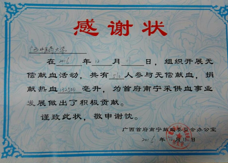 我校率先设立全国高校首个固定献血点、固定无偿献血日和首支固定献血者队伍,是广西高校首支急救护理模拟操作表演队、首支造血干细胞志愿者服务队、首支无偿献血“红色爱心”志愿者服务队。为此,我校荣获2014—2015年度“全国无偿献血促进奖”、2015年南宁驻邕高校无偿献血促进单位一等奖、一人荣获“全国特别贡献奖”、南宁市“红色爱心”无偿献血志愿者服务队我校分队荣获南宁市“杰出志愿者团队”称号。