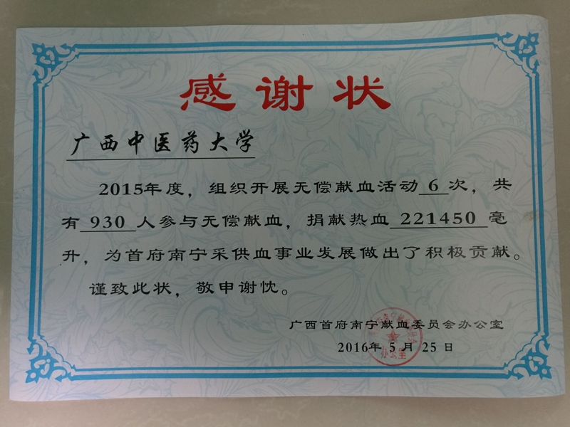 2015年度驻邕高校无偿献血促进单位一等奖