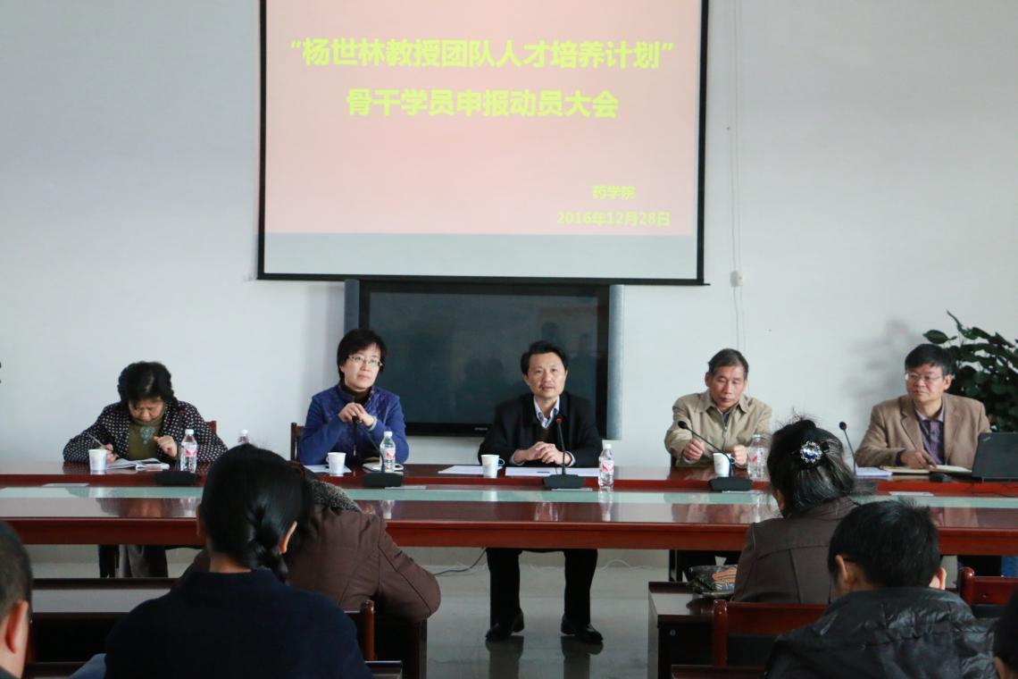 12月28日,我校在仙葫会议室召开了“杨世林教授团队人才培养计划”骨干学员申报动员大会,学校庞宇舟副校长、学科办唐红珍处长、人事处伍丹玉副主任、药学院领导班子、药学院各科室主任、药学院45周岁以下的高级职称教师及博士参会。会议由药学院王勤书记主持。