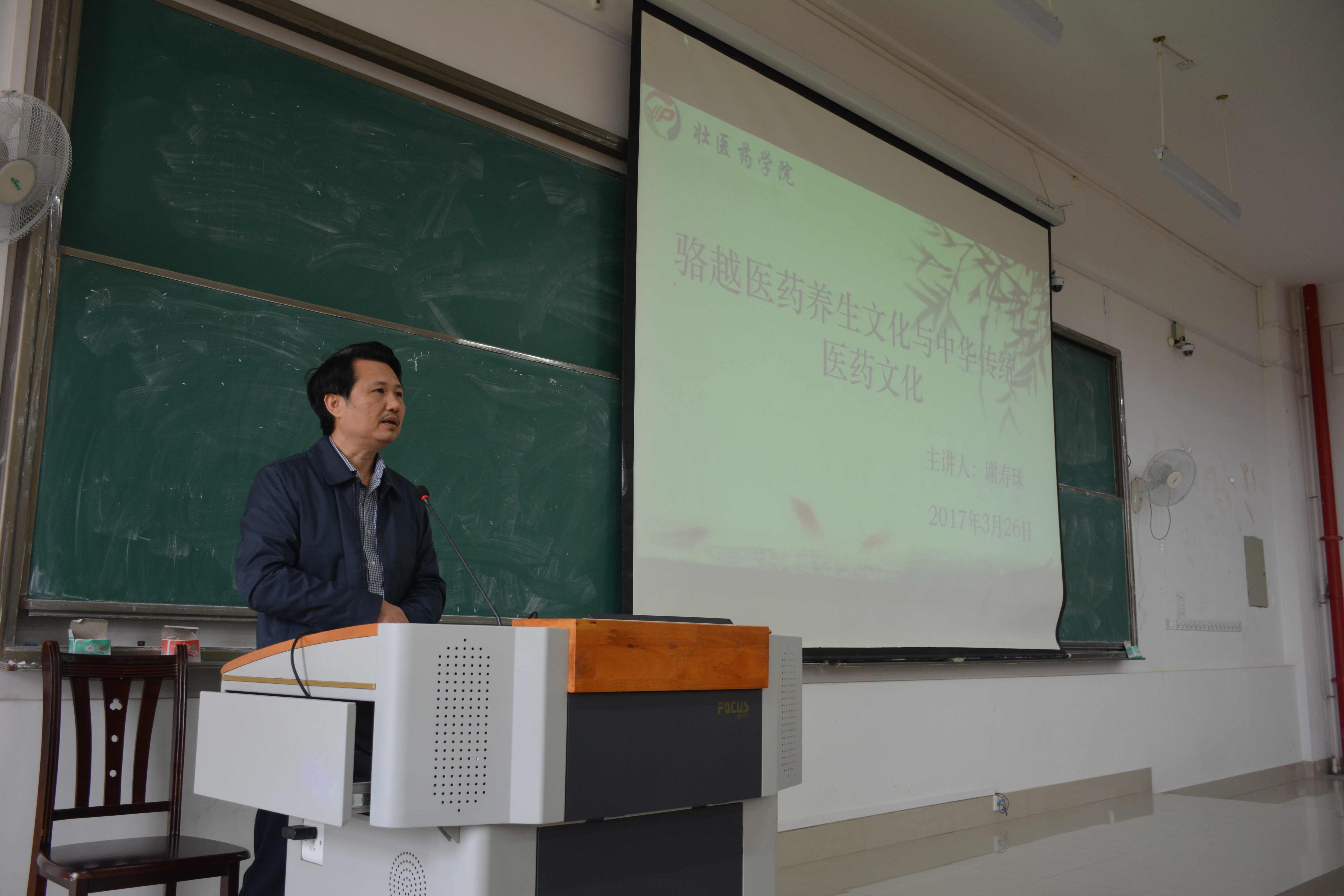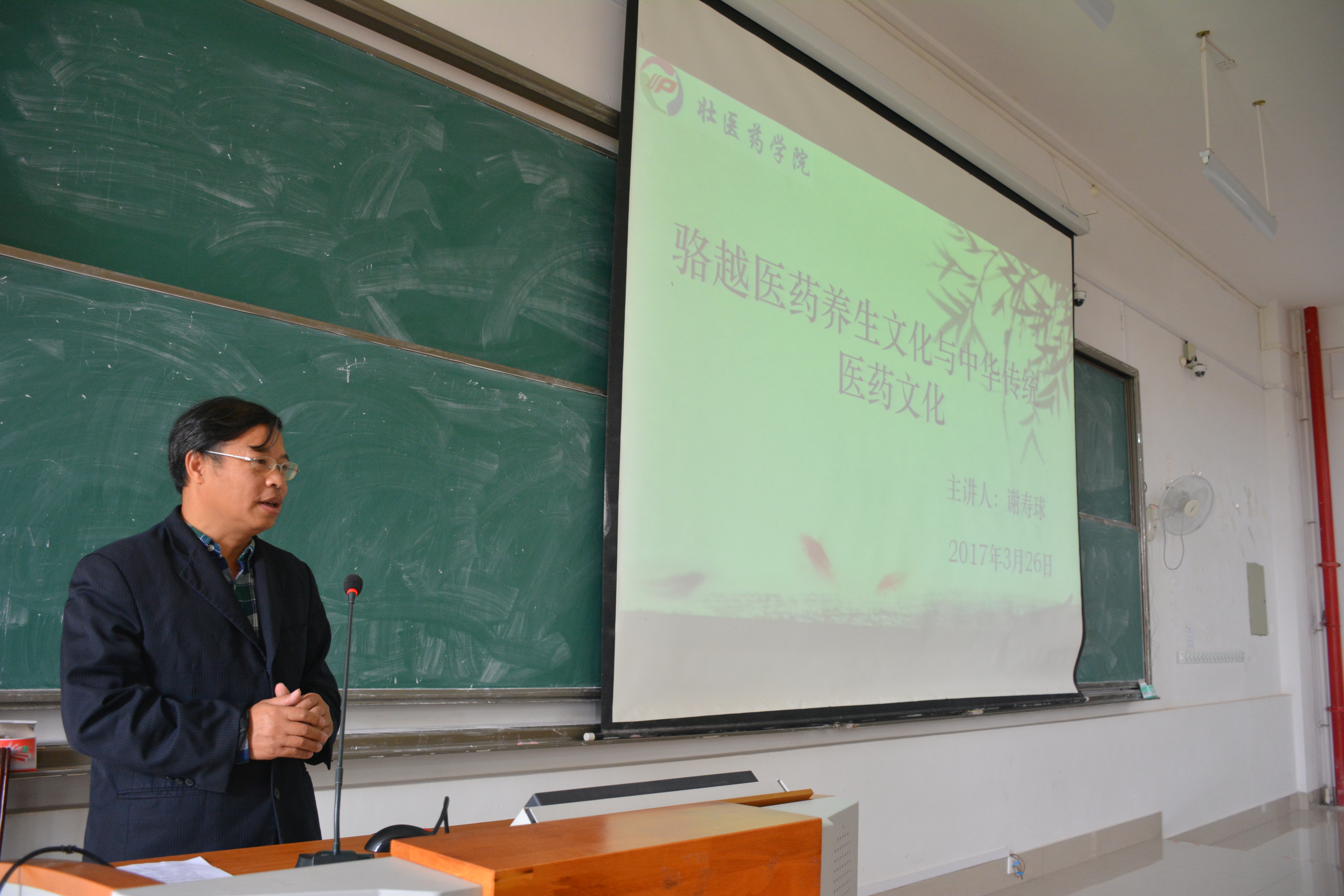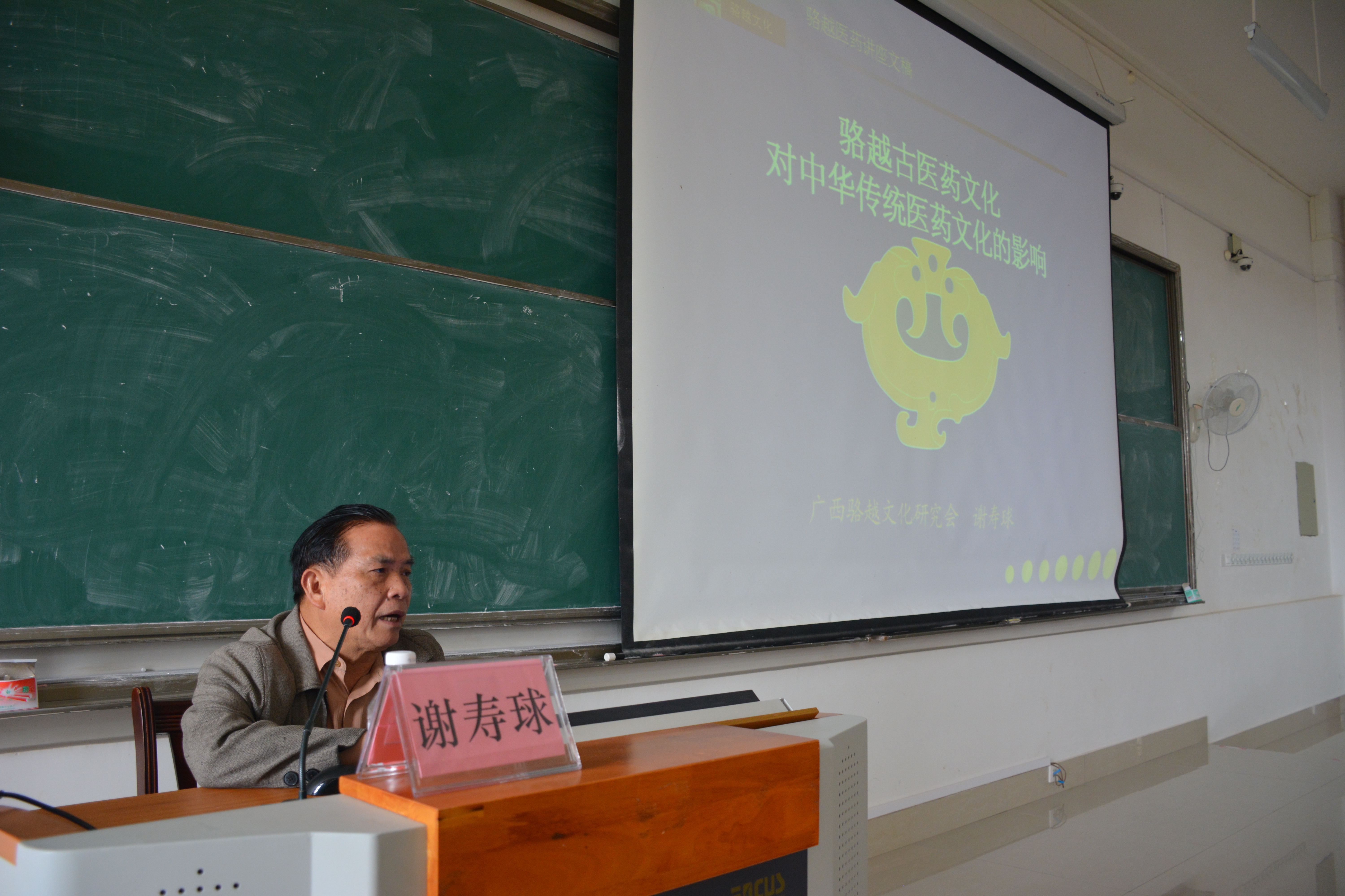 接下来,广西骆越文化研究会谢寿球会长给同学们主讲了“骆越古医药文化对中华传统医药文化的影响”,谢老从骆越古医药文化演绎了现代医学新传奇、古骆越文化是中华文化的重要来源、骆越古医药对中华医药的主要贡献、壮医药文化传承了骆越医药文化的主要遗产四个方面阐述了骆越古医药文化对中华传统医药文化的影响。谢会长对全院师生提出希望和要求,希望我们要把握中医药振兴发展的大好时机,深入挖掘中华医药宝库的精华,发展传承骆越古医药文化,推动中华医药现代化并走向世界。