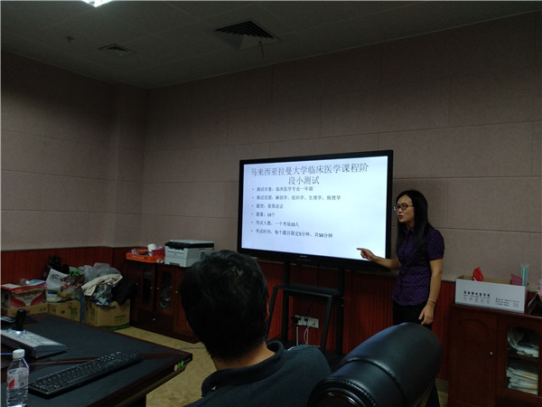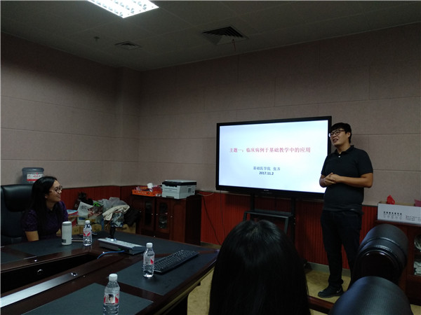 本场沙龙活动由基础医学院的韦燕飞、张齐两位老师主讲,韦老师和张老师均是从马来西亚拉曼大学完成教学能力提升培训的教师队伍中的一员。首先,两位老师通过播放视频的方式让在座教师对拉曼大学的培训有了初步的了解,接着,张老师以“临床病例于基础教学中的应用”为主题,向在座教师介绍了马拉西亚拉曼大学的教学方法,并分享了自己在教学方面的一些收获。最后,韦老师就“医学课程阶段综合小测试与我校转段考试现状的观察和对比”的主题,用生动形象的案例详细介绍了拉曼大学临床医学课程阶段小测试的内容,对其中看图说话的题型在座教师都表示值得借鉴。