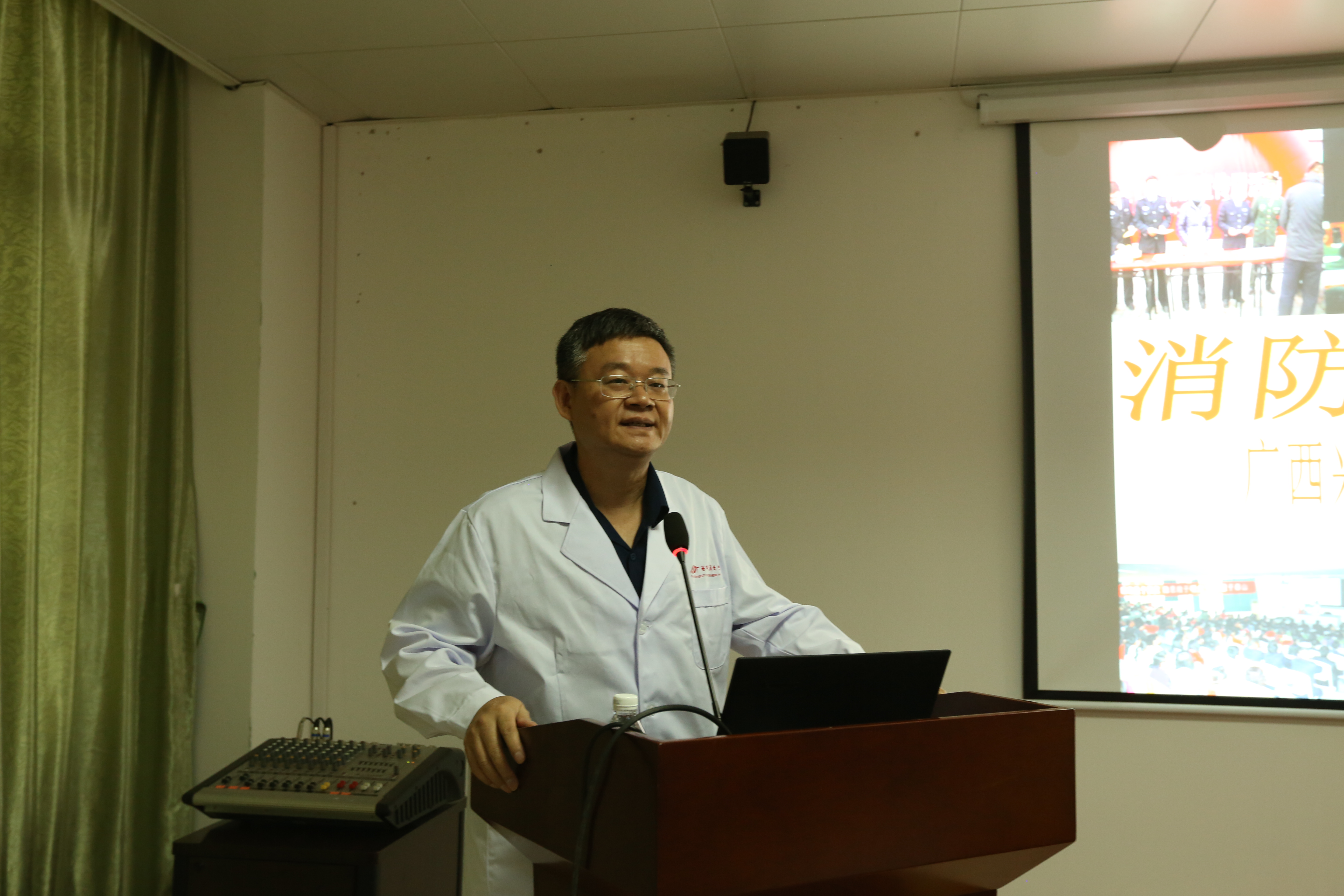 本次培训和演练邀请广西兴六进消防知识宣传中心全扬桢教官担任技术指导,学校武保部冯第林部长担任总指挥,科学实验中心工作人员、学校卫生室医护人员、在格物楼做实验的研究生、本科生以及学校朋宇组保安近200人参加了培训和演练。