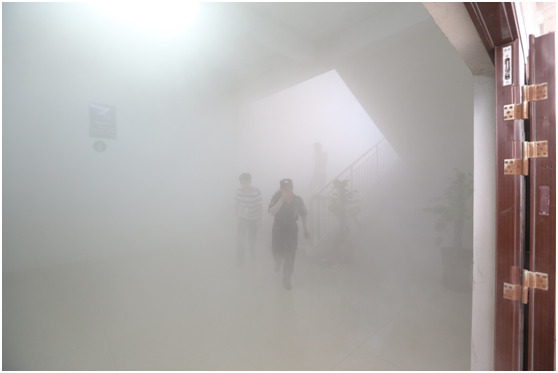 培训课后开展消防演练,师生模拟正常实验工作现场,工作人员通过制造无毒浓烟模拟火灾发生,并拉响消防警报,指挥组通过楼层广播系统指挥人员疏散,保安人员作疏散引导,各实验室师生经楼道撤离现场,到指定地点集中,清点人数,整个过程快速而有序,持续时间不到两分钟。消防演练过后,全体人员进行灭火器使用的实际操作。