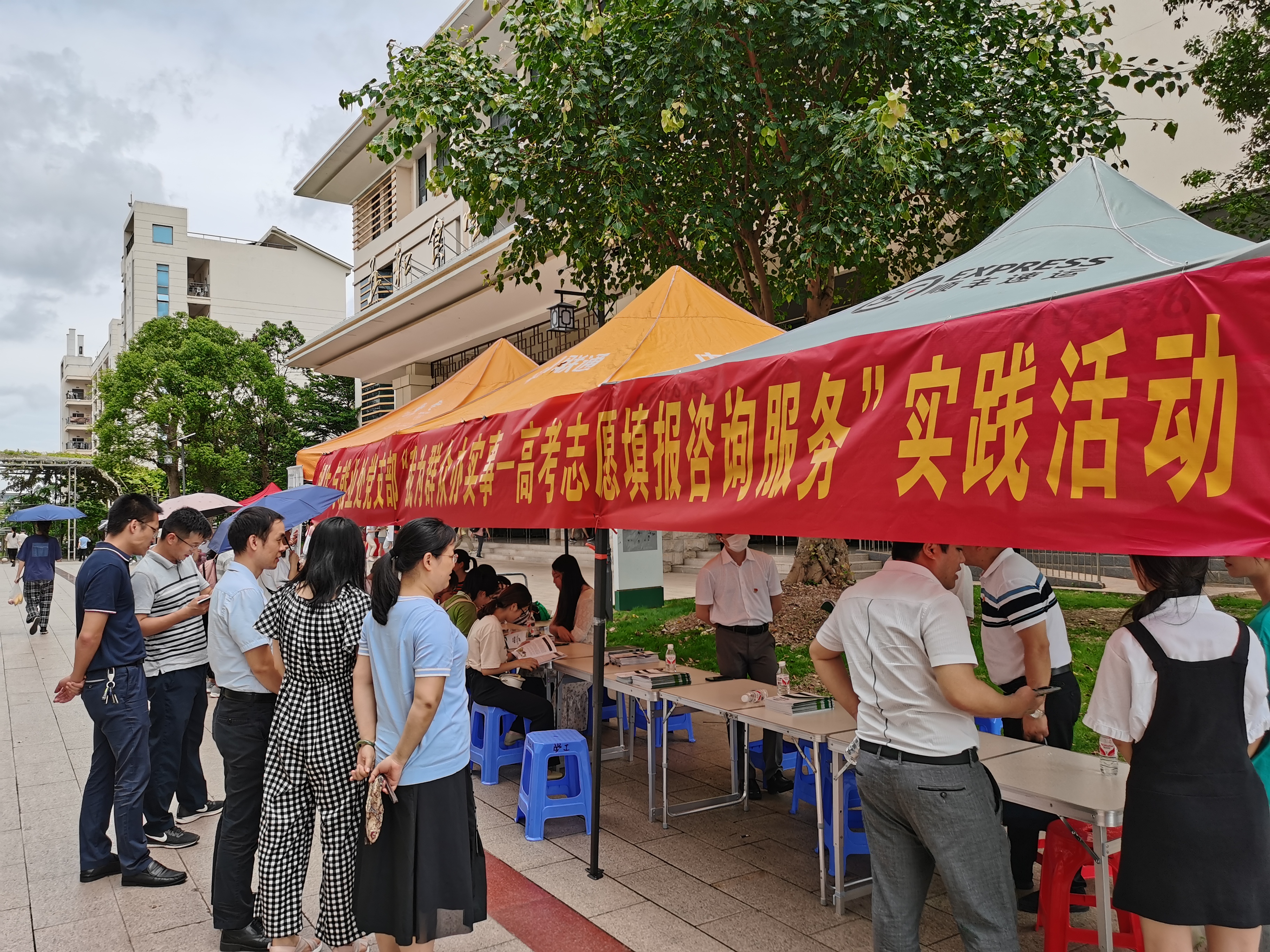 7月1日上午,为深入学习习近平总书记在党史学习教育动员大会上的重要讲话精神,贯彻落实中央及学校党委关于开展党史学习教育的要求,招生与就业处党支部在仙葫校区五和食堂前门,开展“我为群众办实事—高考志愿填报咨询服务”实践活动。