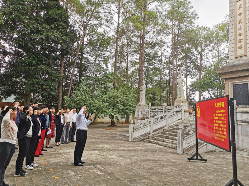 全体党员首先来到广西九大革命烈士陵园之一的坡鉴烈士陵园瞻仰革命烈士,重温入党誓词,聆听在“八三”惨案中牺牲的徐泽长等革命烈士的英雄故事。