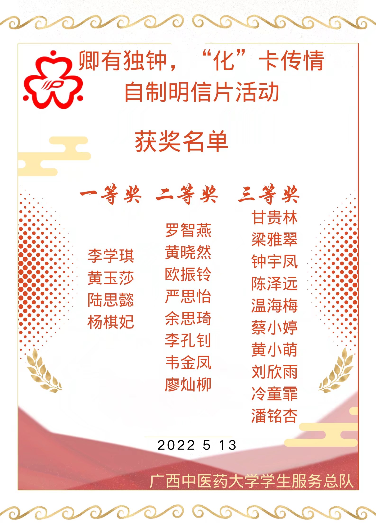 为丰富大学生在校学习生活,激发学生的创作灵感与设计热情,营造和谐健康的校园文化氛围 ,我校于2022年5月份开展了由星空彩票老版本下载学生资助管理中心主办,广西中医药大学学生服务总队承办的“卿有独钟,‘化’卡传情”主题自制明信片活动。
