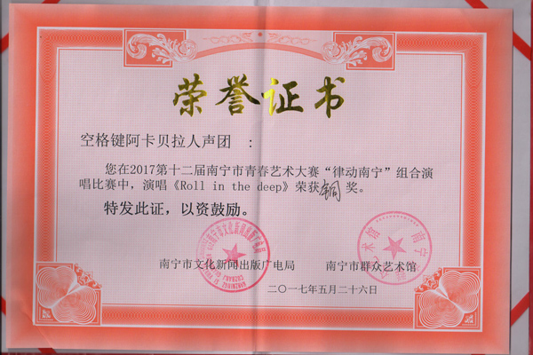 赛恩斯新医药学院空格键纯人声乐合唱团参加2017第十二届南宁青春艺术大赛荣获铜奖