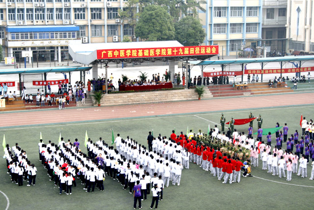 2009118,广西中医学院基础医学院第十九届大学生田径运动会在学院运动场隆重举行。学院学工部(处)部(处)长冼锦华,校团委书记李月发、体育部主任韦军湘、副主任石荣群,基础医学院党委书记何清平、院长戴铭、副书记韦海英等领导以及各二级学院分团委书记和学生会代表出席了此次运动会开幕式。