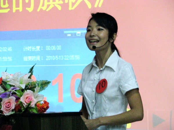 比赛现场还播放了预先录制的视频,参赛选手的亲友团及班主任送上了深切祝福和希望,现场的加油声一浪赛过一浪。最终,付扬华同学以93.86的总分一举摘得桂冠,并荣获最佳台风奖。欧阳迪、刘翠云获二等奖,赵展、梁璐、崔超获三等奖。