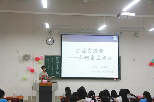 值第五届全国中医青年论坛在本校举办之际,59日晚上,基础医学院在仙葫校区教学楼2303教室成功举办了“医学春秋”系列活动之“我的大学生活——我是如何自主学习” 经验交流会。基础医学院荣幸邀请到本届论坛优秀青年教师、北京中医药大学硕士研究生导师高鹏老师和本届论坛优秀青年学生、北京中医药大学研究生刘伟悦担任本次交流会的主讲嘉宾。