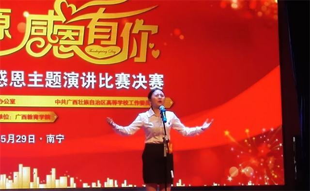 5月29日上午,由自治区文明办、自治区高校工委联合开展的广西高校大学生“饮水思源 感恩有你”主题演讲比赛决赛在广西教育学院圆满落下帷幕,我校参赛选手、2012级师承专业杨晗艺同学的《感恩从心开始,让爱温暖彼此》演讲真实感人,发挥稳定,通过声情并茂的演讲,最终荣获一等奖。