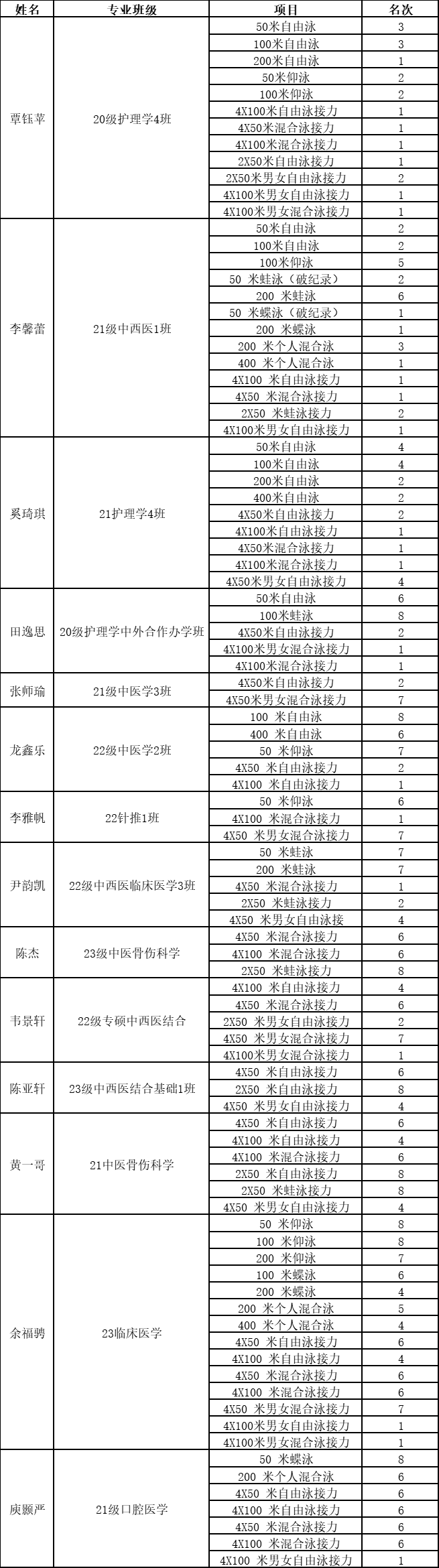 2024年5月18-19日,由广西学校体育卫生艺术学会主办、柳州市学校体育卫生学会协办、柳州市第六中学承办的第三届广西壮族自治区大学生游泳锦标赛成功举办。我校游泳队表现不俗,共取得10枚金牌、10枚银牌和3枚铜牌,并荣获团体总分第二的优异成绩,尤其是来自瑞康临床医学院的李馨蕾同学表现突出,一人独揽三枚金牌,并打破女子本科组50米蛙泳和50米蝶泳赛会纪录,为学校赢得了荣誉。