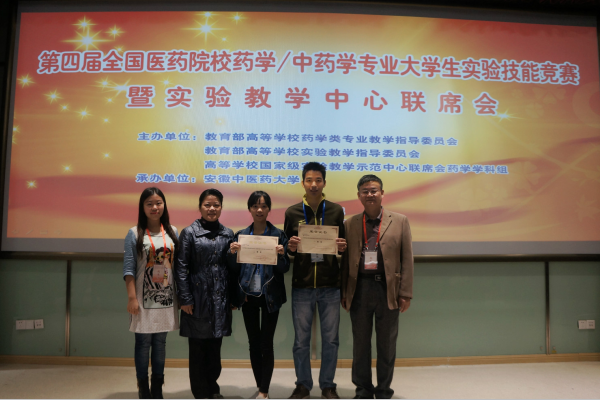 为了充分认识实验教学在培养学生综合素质和创新能力、塑造学生学术道德和科研品格过程中的重要作用,进一步强化我国高校药学/中药学专业实验教学工作,提升学生实验动手和实践创新能力,加强校际交流与合作,教育部高等学校药学类专业教学指导委员会、教育部高等学校实验教学指导委员会、国家级实验教学示范中心联席会药学学科组于2015115-7日在安徽中医药大学举办“第四届全国医药院校药学/中药学专业大学生实验技能竞赛”。我校派出由陈勇院长带队,秦华珍副院长、林瑜老师、2012级中药学专业谭德超同学、2012级中药资源与开发专业巫柳岑同学组成的参赛队参加了比赛。