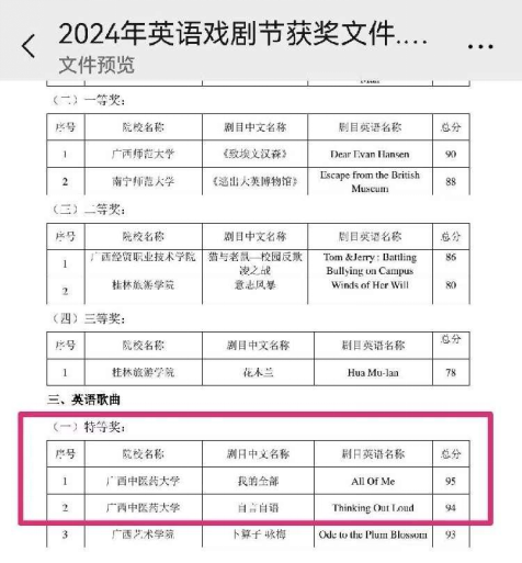 第十九届广西高校大学生英语戏剧节英语歌曲决赛近日圆满落幕,我校选送的三个作品均获得大奖。其中,2024级临床医学的徐哲熠和2023级壮医学的刘承荣获特等奖,2024级中药学的胡文琳荣获一等奖。