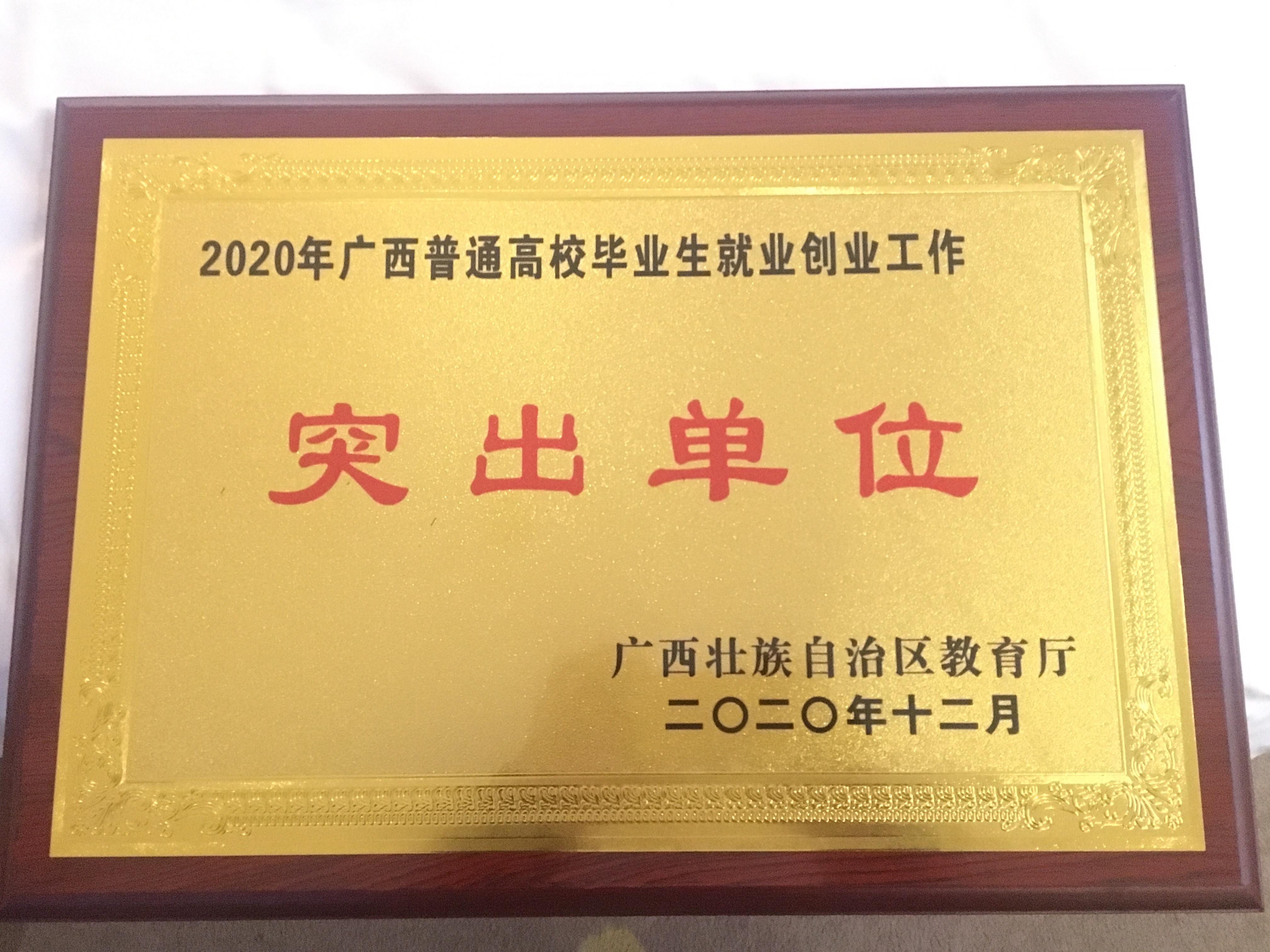 “2020年广西普通高校毕业生就业创业工作突出单位”牌匾