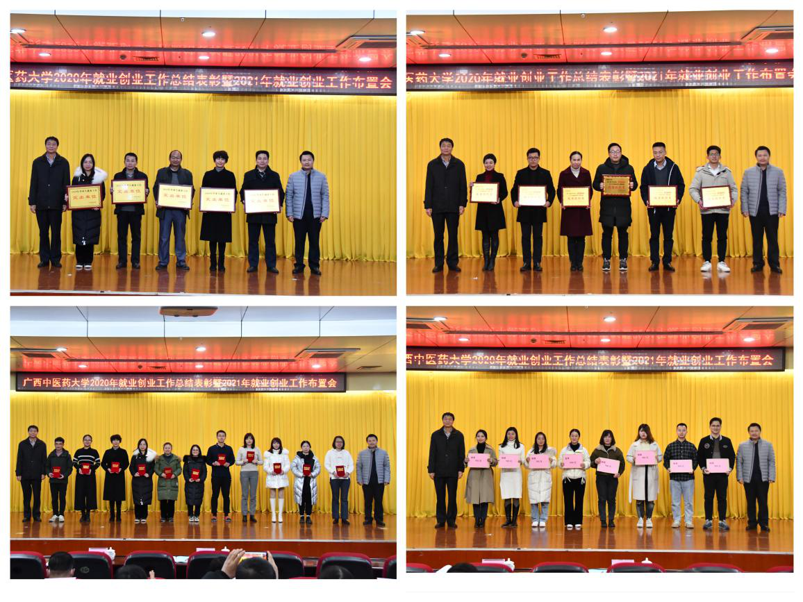 会议还表彰了我校2020年毕业生就业工作先进集体及先进工作者、在第六届中国国际“互联网+”大学生创新创业大赛广西赛区选拔赛及校赛中的获奖项目团队、优秀组织单位及优秀创新创业导师。