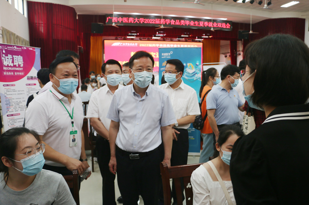 6月17日线下双选会上,学校党委书记莫锦荣、校长姚春、副书记庞宇舟、纪委书记覃宇环、总会计师何刚亮等领导亲临会场指导,了解用人单位招聘情况,与用人单位和毕业生亲切交流;学校教务处、学工处、药学院等职能部门的领导到会场向用人单位了解我校毕业生人才培养质量等情况;参会的用人单位与毕业生进行愉快地洽谈,场面十分热烈。
