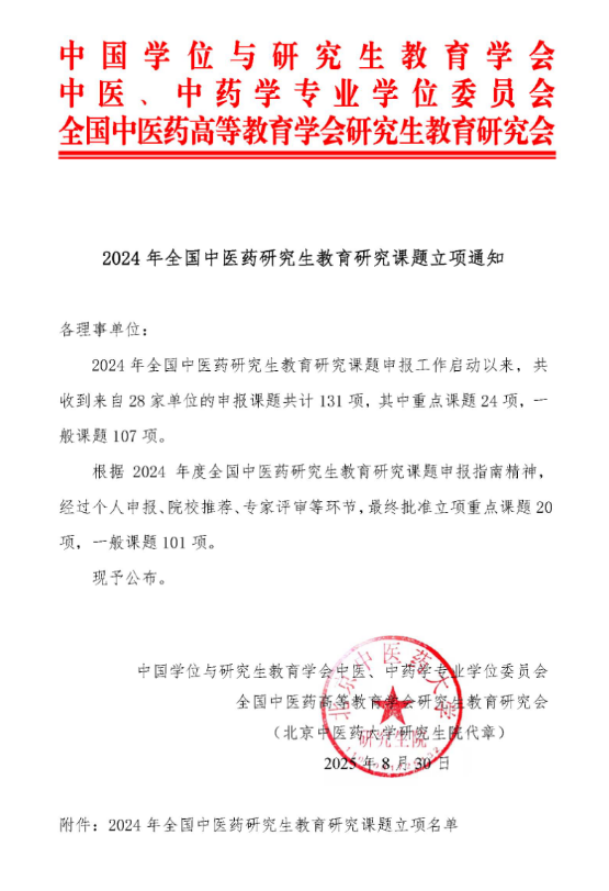 2025年8月30日,2024年全国中医药研究生教育研究课题立项名单正式发布,我校共有5项课题获得立项,其中重点课题 1 项,一般课题 4 项。