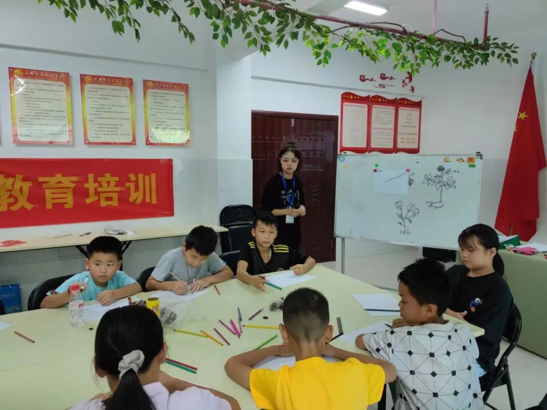 2022年7月15日,志愿者老师给小朋友们复习上一节课桂十味的五味药材,并采用图画结合的方式向小朋友们介桂十味剩下的五味药材:山豆根、鸡血藤、鸡骨草、两面针、广地龙的药效及注意事项。