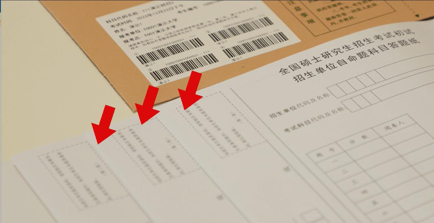 自命题答题纸左上角均设有带序号的条形码粘贴区域。考生确认信息无误后,请将试卷袋方框内条形码按序号粘贴在答题纸条形码粘贴区域(答题纸条形码粘贴区见下图示例)。粘贴好条形码后,请务必在每张答题纸密封线内填写姓名、专业和考生编号等信息。考试结束后,自命题考试科目的试卷、答题纸均需装入原自命题试卷袋小信封。