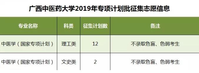 2019年征集志愿-专项计划批 发布时间:2019-07-10 10:23:12 浏览次数: 次 【字体:小 大】 我校此次将征集考生14名,具体专业、名额如下: 征集志愿填报时间:7月10日18:00至7月11日9:00,请考生在规定时间内到广西招生考试院官网(http://www.gxeea.cn)进入“2019年普通高校招生志愿填报”填报征集志愿,并在录取期间保持报名时所留联系电话畅通。 详情请点击“征集志愿”。 分享到: 【打印正文】