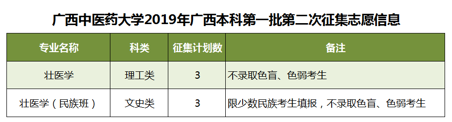 2019年征集志愿-广西本科第一批第二次征集 发布时间:2019-07-18 10:30:02 浏览次数: 次 【字体:小 大】 我校本次将征集壮医学、壮医学(民族班)等专业计划共6名,详情如下: 征集志愿填报时间:7月19日下午18:30至20日上午9:00,请考生在规定时间内到广西招生考试院官网(http://www.gxeea.cn)进入“2019年普通高等学校招生志愿填报”填报征集志愿,并在录取期间保持报名时所留联系电话畅通。 详情请点击“征集志愿”。 分享到: 【打印正文】