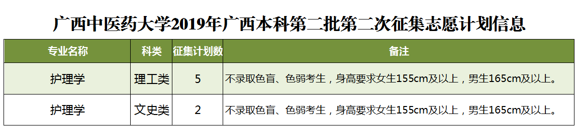 2019年征集志愿-广西本科第二批第二次征集 发布时间:2019-07-28 10:50:54 浏览次数: 次 【字体:小 大】 我校本次将征集护理学专业计划共7名,详情如下: 征集志愿填报时间:7月28日下午18:00至29日上午9:00,请考生在规定时间内到广西招生考试院官网(http://www.gxeea.cn)进入“2019年普通高等学校招生志愿填报”填报征集志愿,并在录取期间保持报名时所留联系电话畅通。 详情请点击“征集志愿”。 分享到: 【打印正文】