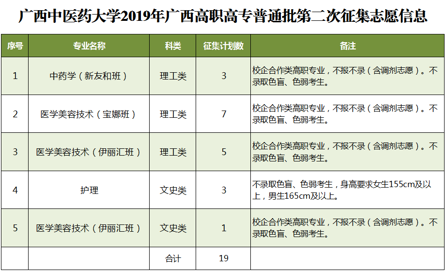 2019年征集志愿-广西高职高专普通批第二次 发布时间:2019-08-13 11:23:49 浏览次数: 次 【字体:小 大】 我校本次将征集中药学(新友和班)等专业计划共19名,详情如下: 征集志愿填报时间:8月13日下午18:30至14日上午9:00,请考生在规定时间内到广西招生考试院官网(http://www.gxeea.cn)进入“2019年普通高等学校招生志愿填报”填报征集志愿,并在录取期间保持报名时所留联系电话畅通。 详情请点击“征集志愿”。 分享到: 【打印正文】