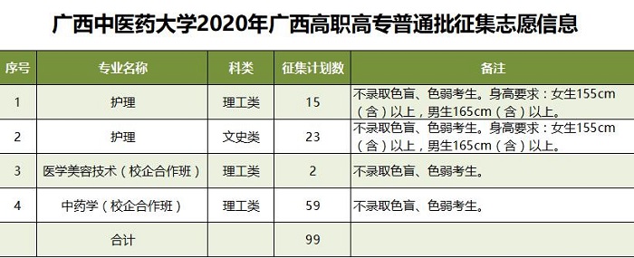 我校本次将征集护理、医学美容技术(校企合作班)、中药学(校企合作班)专业缺额计划99名,详情如下: