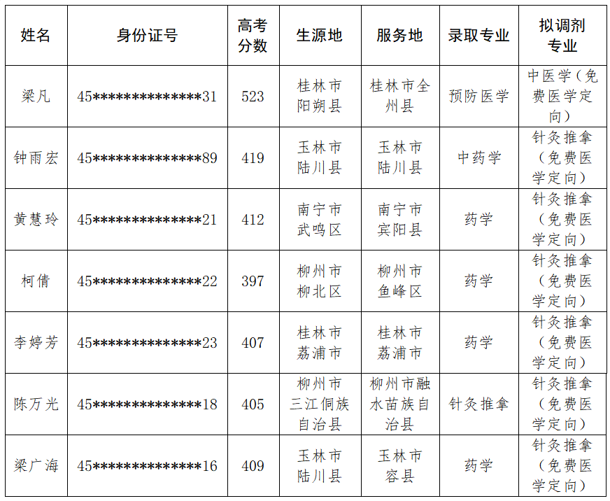 根据《自治区卫生健康委 自治区教育厅 自治区人力资源社会保障厅 自治区中医药局关于调整农村订单定向医学生免费培养项目招录事项的通知》(桂卫科教发〔2022〕2号)以及我校《关于全面完成2024年农村订单定向医学生免费培养招生任务的通知》等文件精神,经学生自愿报名、学校资格审查,拟将2024级梁凡同学的录取专业调剂为本科中医学(免费医学定向)专业,拟将2024级钟雨宏等六名同学的录取专业调剂为高职针灸推拿(免费医学定向)专业,现将名单公示如下: