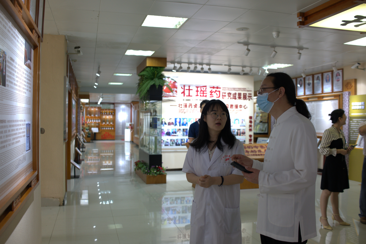 为了落实国家中医药管理局等八部门《“十四五”中医药文化弘扬工程实施方案》,推动部署“十四五”期间中医药文化建设工作。9月18日上午,河北省中医药文化交流协会副会长兼秘书长袁野,到我平台考察交流。广西壮瑶药重点实验室技术副总监张淼、壮瑶药协同创新中心技术副总监谢凤凤等我平台师生陪同考察,张淼老师向他们介绍了我平台壮瑶药研究理论成果及壮瑶药研究的历史、进展等,袁野副会长就中医药壮瑶医药文化内涵建设对我平台取得成就给予高度肯定。
