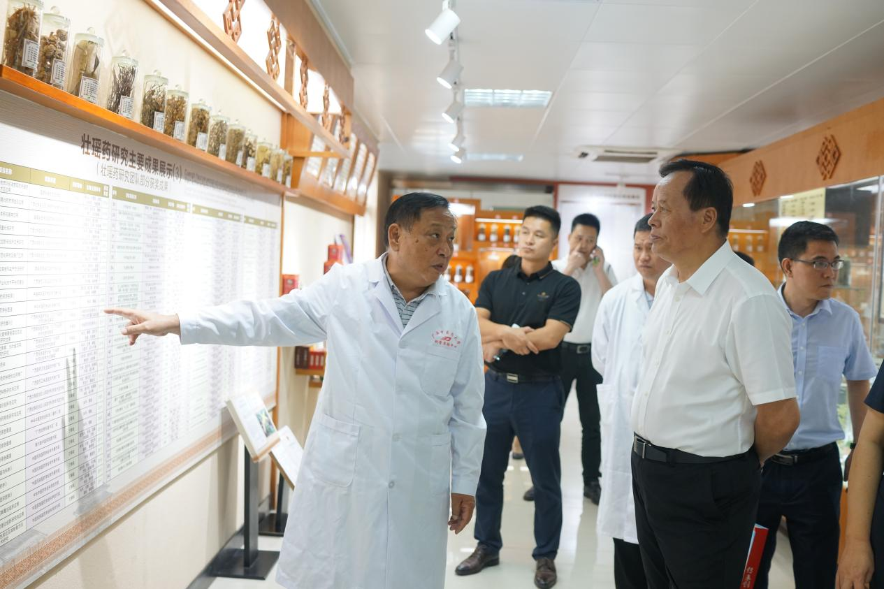 图2 朱华教授为仝小林院士介绍壮瑶药研究主要成果
