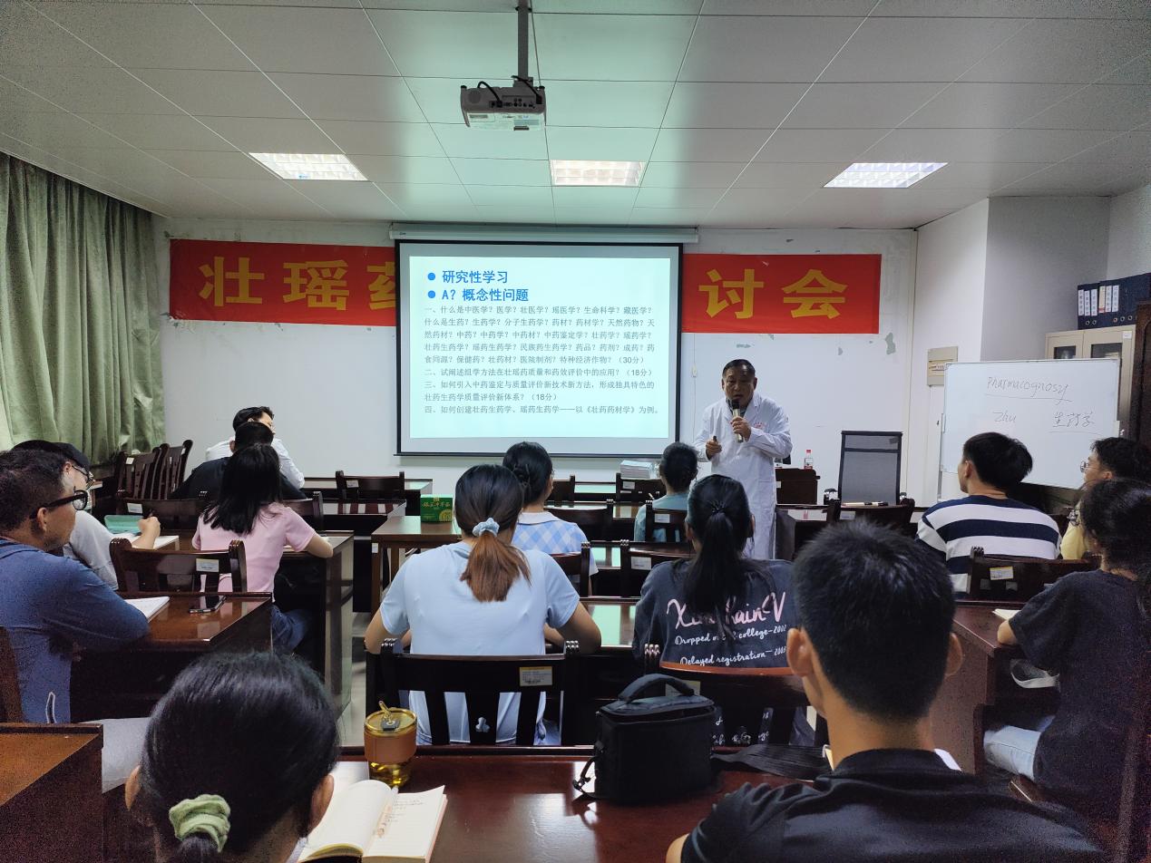 9月27日下午,为了落实国务院“实施壮瑶医药振兴计划,建立质量标准体系”和自治区政府“壮瑶医药振兴计划”的文件精神,营造良好的学术氛围,加强学术交流,拓展学术领域,促进中医药壮瑶医药事业与产业高质量发展,广西壮瑶药重点实验室等召开壮瑶药学术研讨会。主讲人为朱华教授。会上,朱华教授讲解了如何开展研究性学习,一概念性问题研究,何为壮药学?何为瑶药学;二思维性问题,何为科学思维与中医药思维?何为药性理论与现代研究?三战略战术问题,壮瑶医药振兴计划,建立质量标准体系的一大战略与五大突破:理论突破、资源突破、标准突破、产品突破和人才突破;四如何推进中医药壮瑶医药传承创新;五成果转化问题。他还讲述了三联互动(调气、补虚、解毒)的选药原则,四位一体(品种、品质、疗效、应用)的壮瑶药筛选体系、壮医的三道两路及瑶医的盈亏理论、对药食同源的认知等,提出建立完善的质量标准,做好配方配伍及严谨的科学循证研究,是我们的责任。