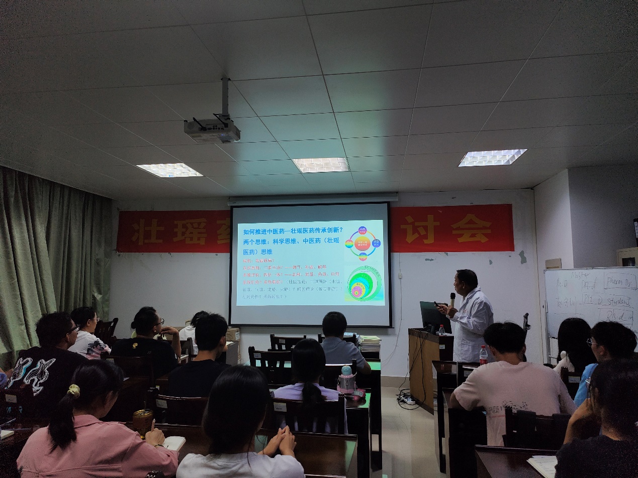 10月09日下午,为了落实国务院“实施壮瑶医药振兴计划,建立质量标准体系”和自治区政府“壮瑶医药振兴计划”的文件精神,营造良好的学术氛围,加强学术交流,拓展学术领域,促进中医药壮瑶医药事业与产业高质量发展,广西壮瑶药重点实验室、壮瑶药协同创新中心、广西民族药资源与应用工程研究中心、国家药监局中药材质量监测与评价实验室(联合单位)、国家级一流专业中药学建设点、星空彩票老版本下载一中南大学壮瑶药研究联合实验室、广西产5种壮瑶药材质量标准与产品开发研究、国家自然科学基金广西产铁皮石斛生长途径调控与药材品质相关性的研究、瑶药三泡外用洗液的研发与推广、广西一流学科中药学(民族药学).广西重点学科壮药学、科技部外专项目团队等项目平台(团队)召开壮瑶药学术研讨会(壮瑶药研究专论)。朱华教授作主题报告。他就壮瑶药研究专题的立项背景;技术路线、方法、关键技术问题及项目水平、经济效益、社会效益、推广应用等方面进行论述。重点在如何推进中医药壮瑶医药传承创新,两个思维(科学思维与中医药壮瑶医药思维)进行系统研究,提出只有坚持壮医药理论(例如三道两路),瑶医药理论(例如盈亏平衡)思维和坚持科学思维的结合,壮瑶药研究专题才能真正做的传承创新,促进壮药医药高质量发展,造福人类。广西民族药资源与应用工程中心常务副主任滕建北教授,张淼老师与会。
