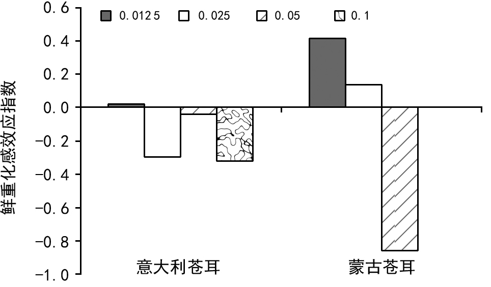 由图5、图6可看出,小白菜幼苗鲜重在意大利苍耳子和蒙古苍耳子处理中均呈先升后降的趋势。鲜重RI 值显示,本地苍耳子水浸提液对小白菜幼苗鲜重始终具有化感抑制作用,意大利苍耳子和蒙古苍耳子2 种供体则呈低促高抑的化感作用,其中化感抑制作用均随浸提液浓度的增加而增大,浸提液浓度处理为0.1g/mL时,以意大利苍耳子处理抑制作用最大,其次是蒙古苍耳子。