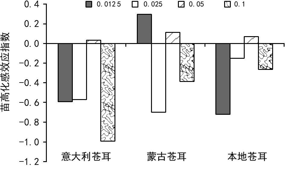 幼苗期作为植物生命周期中较为关键的时期之一, 该阶段对外界逆境较为敏感[17,18,19]。化感物质对茎生长的抑 制作用,将导致植株矮小、瘦弱,从而影响其对光的竞 争。3种不同苍耳浸提液处理中,同一浸提液处理、不 同浓度对小白菜幼苗苗高均有一定影响,差异显著。且 植物种类不同,抑制的起始浓度不同;此外,小白菜幼苗 鲜重同样也受到不同程度的抑制作用,且意大利苍耳子 和蒙古苍耳子2 种浸提液处理小白菜幼苗呈现低促高抑的化感作用,对本地苍耳子的苗高也有一定影响。